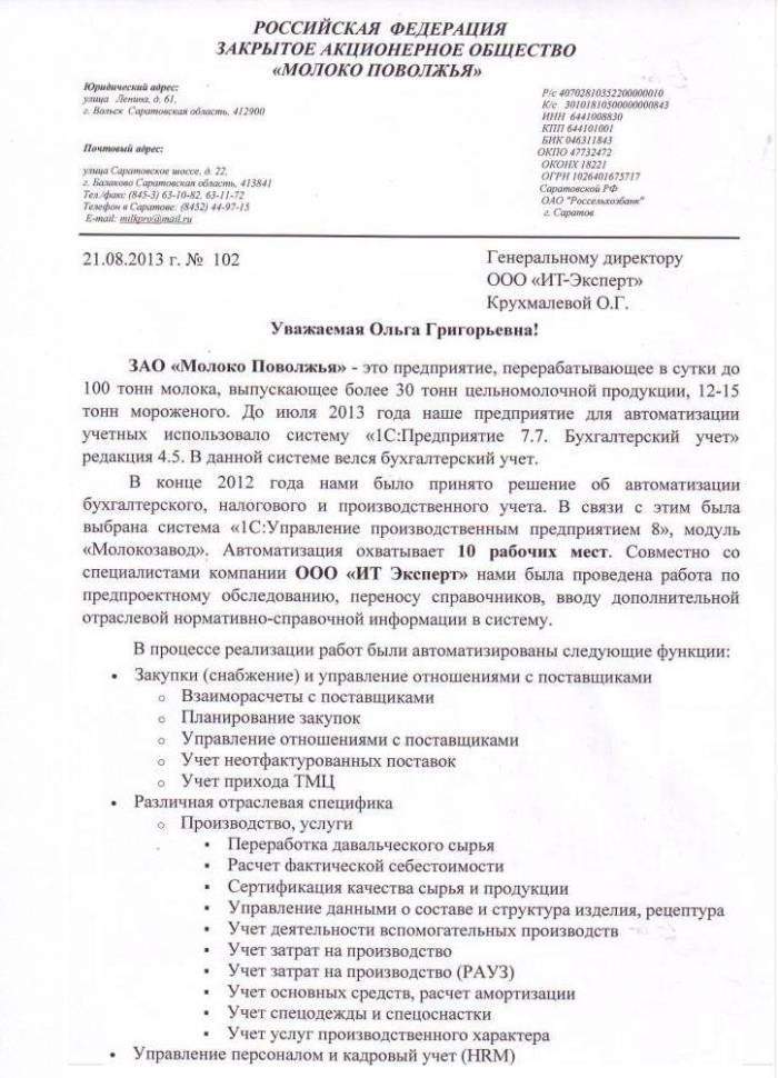 ЗАО «Молоко Поволжья» - это предприятие, перерабатывающее в сутки до 100 тонн молока, выпускающее более 30 тонн цельномолочной продукции, 12-15...