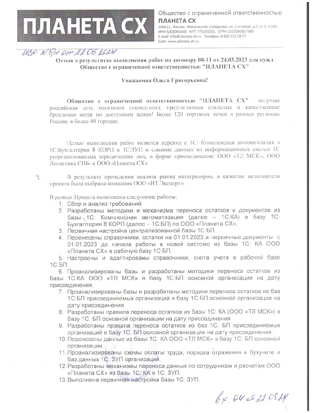 - 4. Перенесены справочники, остатки на 01.01.2023 и первичные документы с 01.01.2023 до начала работы в новой системе из базы 1С: КА ООО «Планета СХ» в рабочую базу 1С:БП.